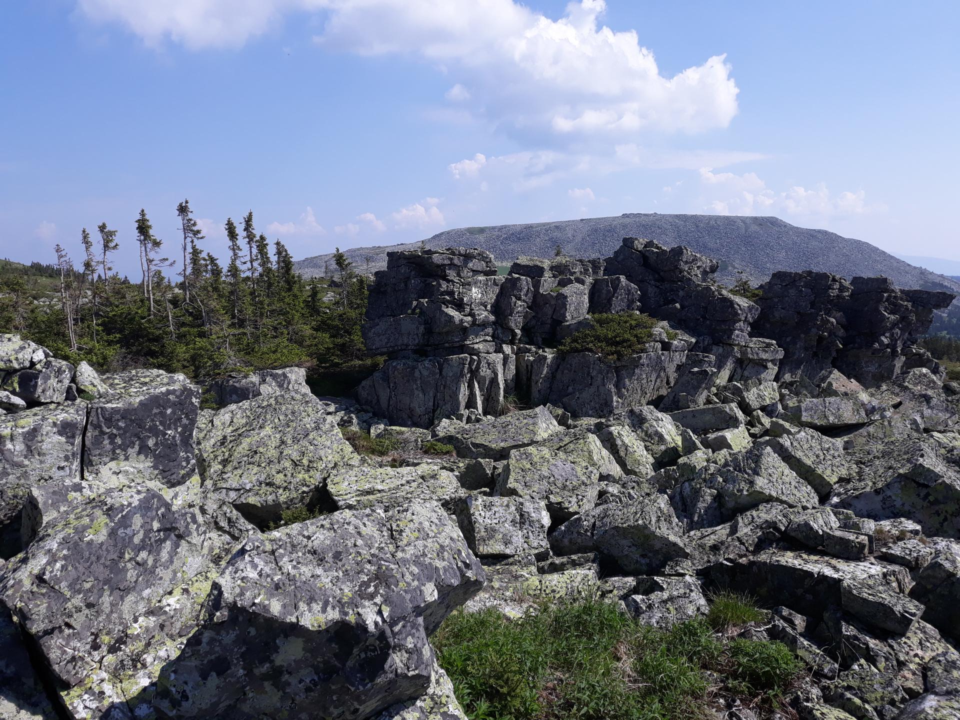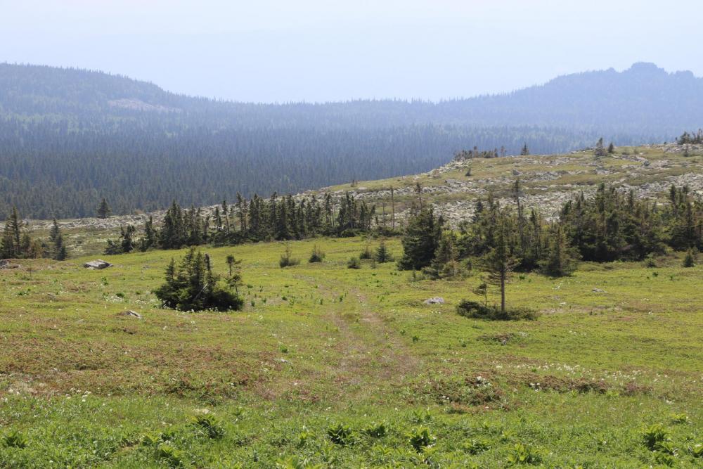 «Младшая сестра» Поперечной. Находятся они недалеко друг от друга и почти одинаковы по высоте. Главное отличие в том, что вершина Поперечной — это можжевелово-каменистое плато, а вершина Круглой — тундра с богатыми ягодниками. Седловина между этими горами также представлена тундрой. Местами на седловине встречаются мокрые участки, вода может быть подо мхами даже в сухую летнюю погоду.